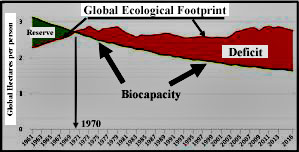 Mathis Wackernagel and The Global Footprint Network, studies show that the Earth's ecological reserves of biological resources no longer exceed the organic capacity of the Earth to replenish itself. In other words, the global ecological footprint of the world has been in deficit since about 1970. (Figure 16a) The changes to the Earth’s surface are seen in the steadily increasing footprints of all the different types of land use. Increases in carbon waste are the greatest. (Figure 16 b)